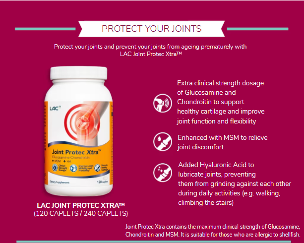 LAC Joints Joint Protec® Xtra – Glucosamine Chondroitin + MSM + HA (120 caplets)